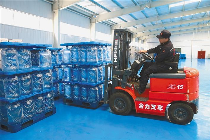 圖為在山南市雅礱天然飲品公司,當(dāng)?shù)卮迕翊稳蕷W珠正搬運(yùn)大桶水。 記者次珍攝
