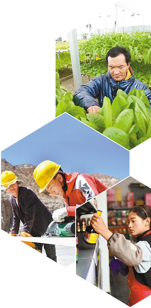 ①在噶爾縣生態(tài)農(nóng)業(yè)產(chǎn)業(yè)園內(nèi),噶爾縣左左鄉(xiāng)上左左村村民宿加在查看蔬菜生長情況。 ②八宿縣擁巴鄉(xiāng)村民格松旺扎(右)在八宿縣西巴村小型磚廠里忙碌。 ③丁青縣尺牘鎮(zhèn)烏巴村村民斯朗德吉在尺牘鎮(zhèn)的一家超市里打工。新華社記者 詹彥 攝