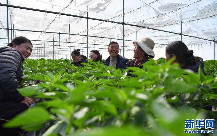 陳千(前)和種植戶在大棚里查看蔬菜長勢(2月25日攝)。新華社記者 晉美多吉 攝