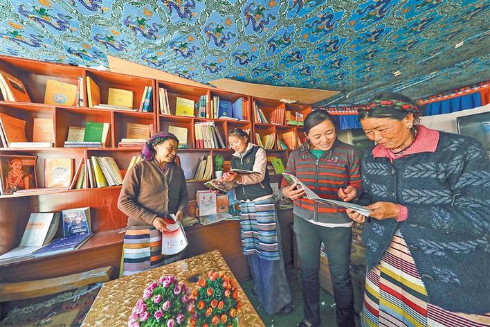 圖為央拉(右二)和合作社婦女們在閱讀室閱讀書籍。記者 格桑吉美 攝