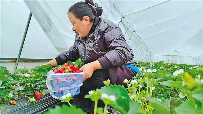 圖為達瓦在溫室大棚里采摘草莓。 記者 胡文 通訊員 范清梅 攝