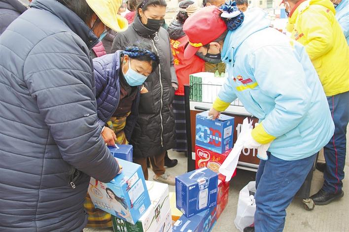 圖為中石油西藏日喀則銷售分公司日喀則市區(qū)加油站黨員為社區(qū)群眾發(fā)放慰問(wèn)品。記者 索朗瓊珠 次仁片多 攝