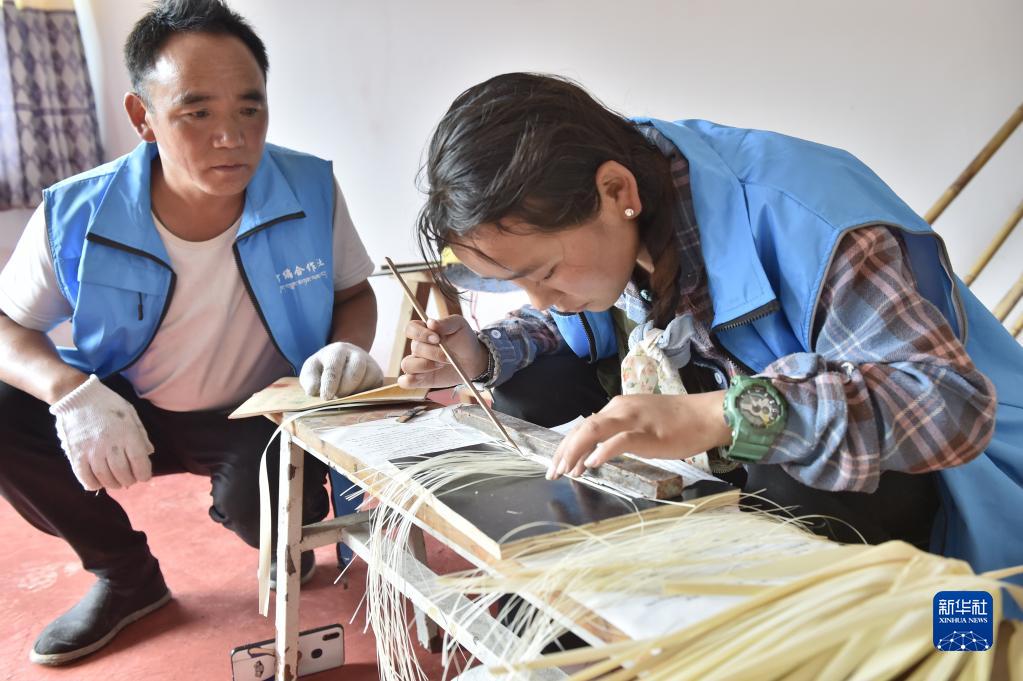 9月15日,西藏定結縣陳塘鎮(zhèn)農民、夏爾巴竹器手工藝傳承人加布(左)指導村民用竹皮編織唐卡。新華社發(fā)(索朗羅布 攝)