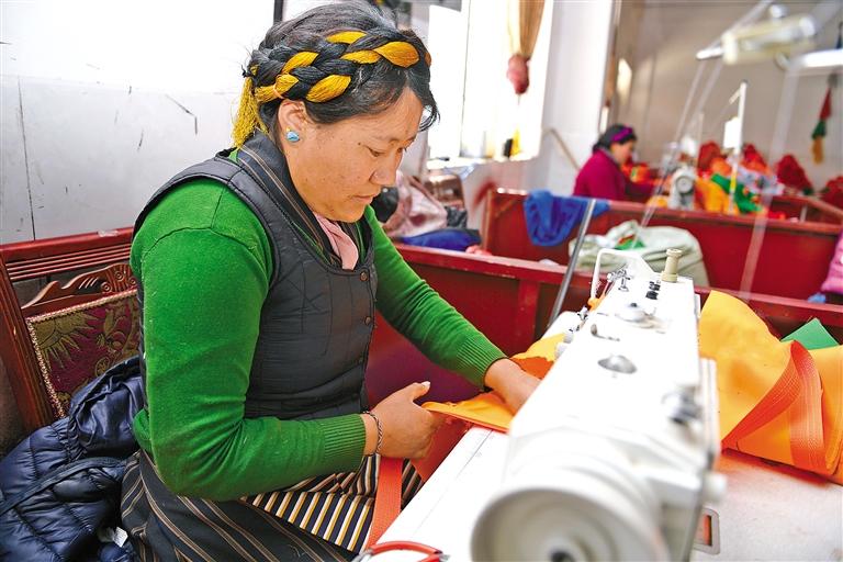 圖為拉薩市尼木縣民族雕刻紡織合作社的技師在縫制產(chǎn)品。記者 丹增群培 攝