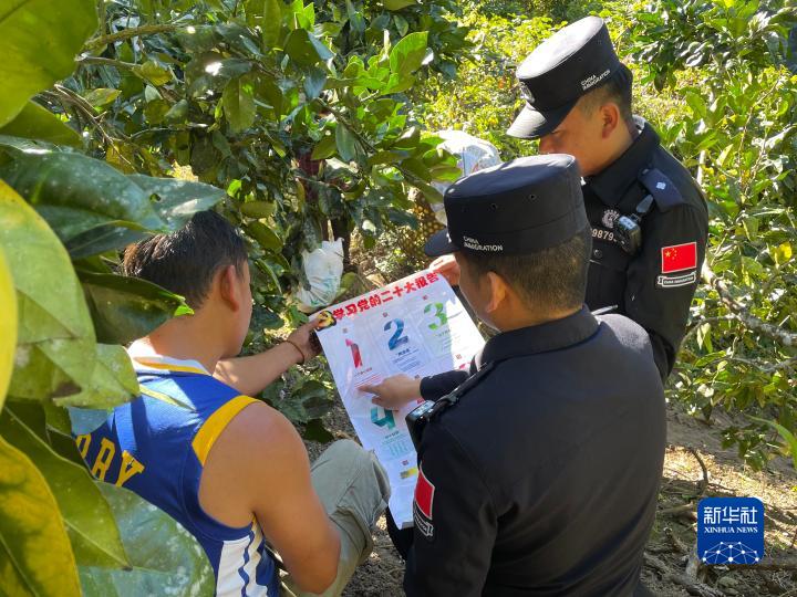 墨脫縣邊境派出所民警在墨脫鎮(zhèn)米日村蜜桔種植基地為群眾宣講黨的二十大精神。記者:李鍵、王澤昊 圖片由受訪者提供
