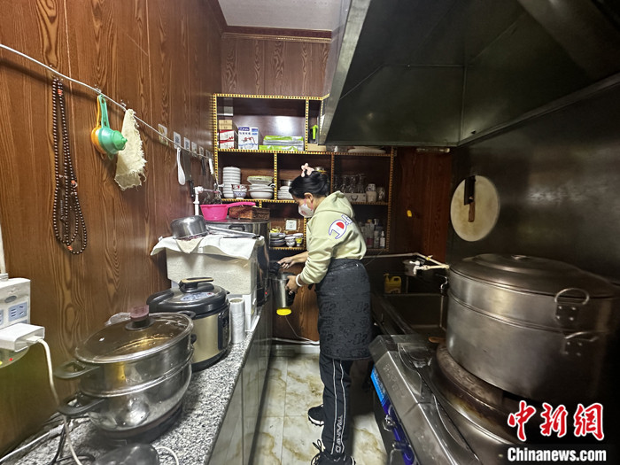資料圖為長江源村的一家藏餐吧內(nèi),店主李新財?shù)钠拮釉诿β怠?中新社記者 李雋 攝