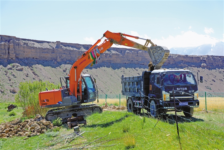 普蘭縣普蘭鎮(zhèn)仁貢村孔雀施工隊的機械車輛在施工,當(dāng)?shù)厝罕娫谄仗m縣普蘭鎮(zhèn)施工隊務(wù)工,一天可增收230元。記者 溫凱 攝