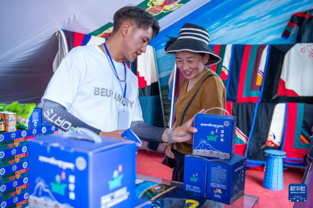 革吉縣鹽湖鄉(xiāng)羌麥村的村民旦真旺杰(左)在展銷(xiāo)會(huì)現(xiàn)場(chǎng)為顧客介紹產(chǎn)品(8月22日攝)。新華社發(fā)(旦增努布攝)