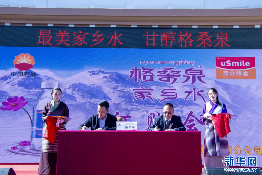 11月15日,“家鄉(xiāng)水·格桑泉”訂購會現(xiàn)場合作單位雙方進行簽約。新華網(wǎng) 旦增努布 攝