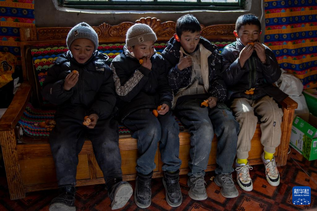 申扎縣馬躍鄉(xiāng)貝嘎四村的幾名小朋友在村里的“偏遠(yuǎn)鄉(xiāng)鎮(zhèn)果蔬配送試點項目”直銷點,買來當(dāng)天供銷合作社配送來的新鮮水果品嘗(1月5日攝)。新華社記者姜帆 攝