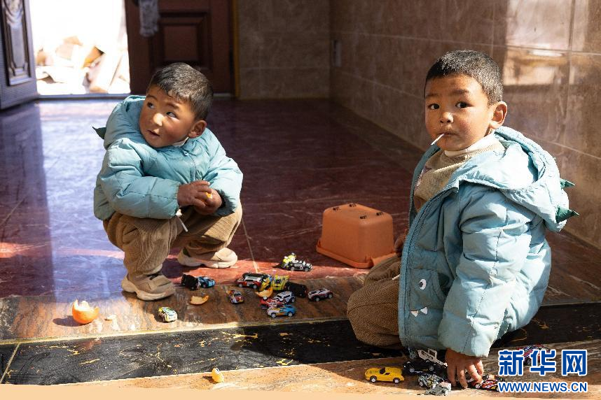 圖為貢嘎的孫子們在光潔的地面上玩耍(1月29日攝)。新華網(wǎng)發(fā) 李騰 攝