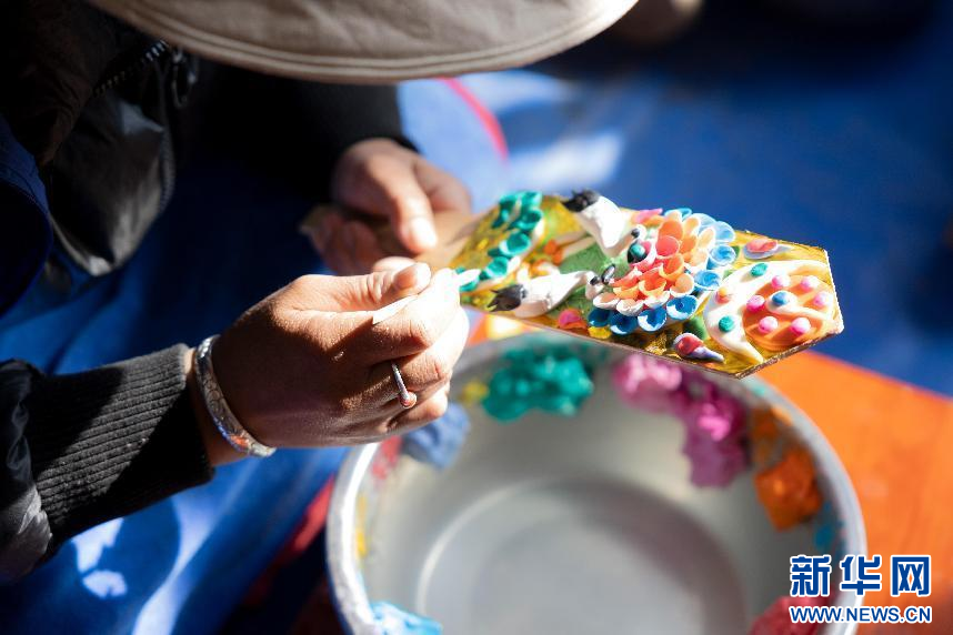 圖為西藏現(xiàn)代服務(wù)業(yè)技工學(xué)校的學(xué)員制作出的卡塞“德格”(1月29日攝)。新華網(wǎng)發(fā) 李騰 攝