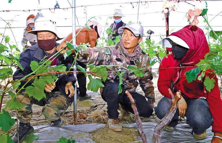 圖為技術(shù)員指導(dǎo)群眾為葡萄剪枝。記者 旦增蘭澤 攝