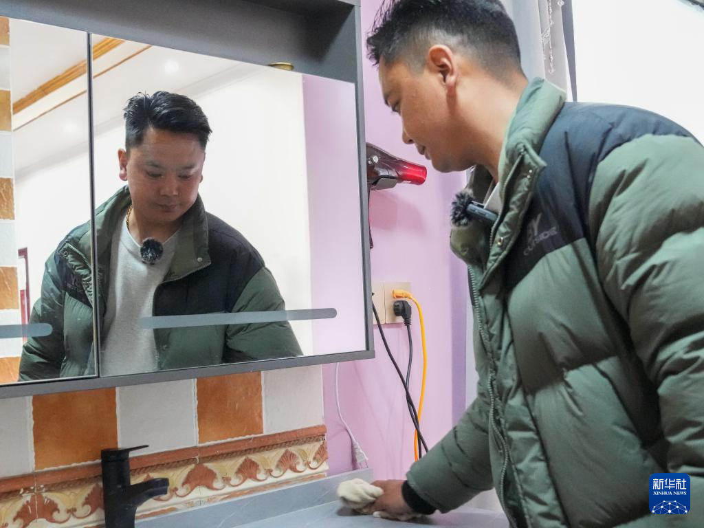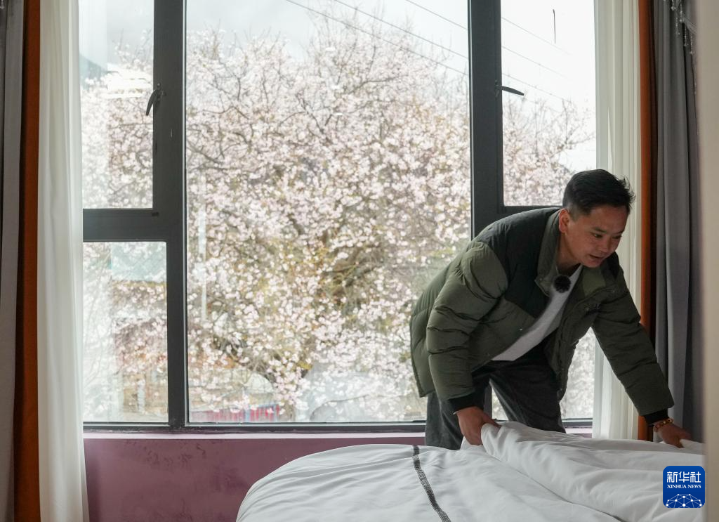 洛松頓珠在自家民宿內整理房間(4月2日攝)。新華社記者 丁汀 攝