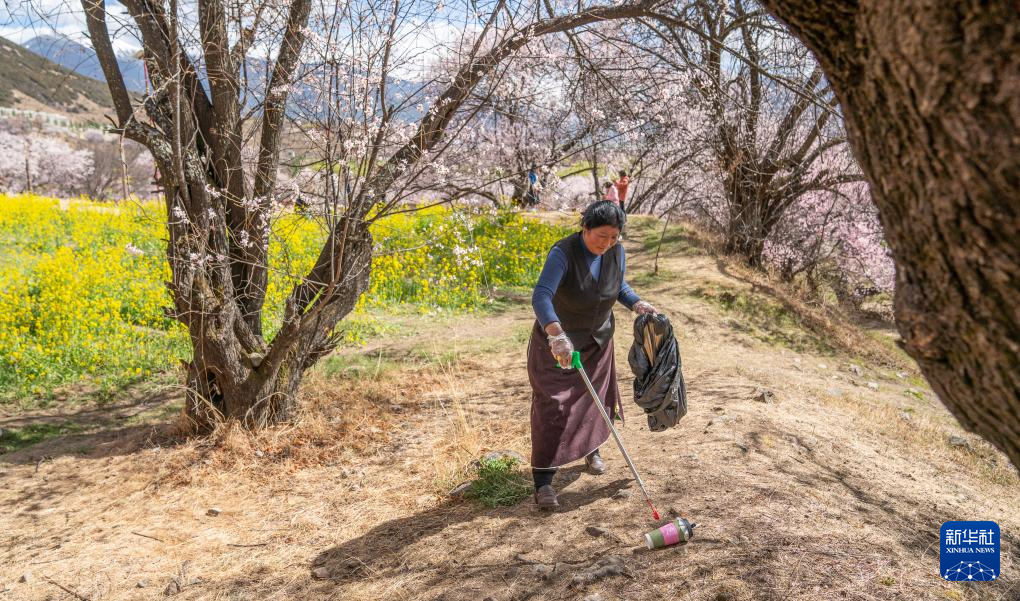 尼瑪曲吉在嘎拉村桃花園里撿拾垃圾。新華社記者丁增尼達(dá) 攝