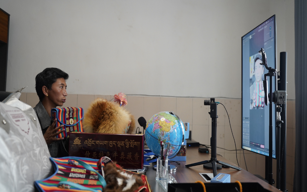 圖為倉(cāng)秋多吉調(diào)試直播設(shè)備現(xiàn)場(chǎng)(8月24日攝)。新華網(wǎng) 謝炆圻 攝
