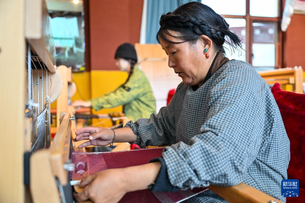 氆氌是藏族群眾用來制作藏式衣物的毛織品,其工藝迄今已有上千年歷史。在上海援藏幫扶下,這項傳統(tǒng)技藝如今已成為當?shù)亍鞍⒓选保ú卣Z意為“大姐”)們的致富新途徑,煥發(fā)出新的生機。