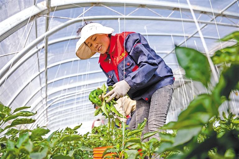 拉薩冬意漸濃,園區(qū)連片的溫室大棚,在冬日暖陽下熠熠生輝,宛如一個個孕育希望的“菜籃子”,豐富冬日市場供應(yīng)。走進蔬菜大棚,棚內(nèi)暖意融融、綠意盎然,黃瓜、西紅柿、青椒等各類蔬菜均已進入成熟期,長勢十分喜人。眼下,正是大棚青椒采摘期,一壟壟、一株株青椒掛滿枝頭,工作人員三五成群忙著采摘,現(xiàn)場一派繁忙景象。“采摘青椒要向上折,這樣才不會損傷植株?!痹诘┰銮闹笇?dǎo)下,工作人員很快完成了采摘工作,打包、稱重后,37袋青椒被整齊地擺放在一起,等待著裝車發(fā)貨。