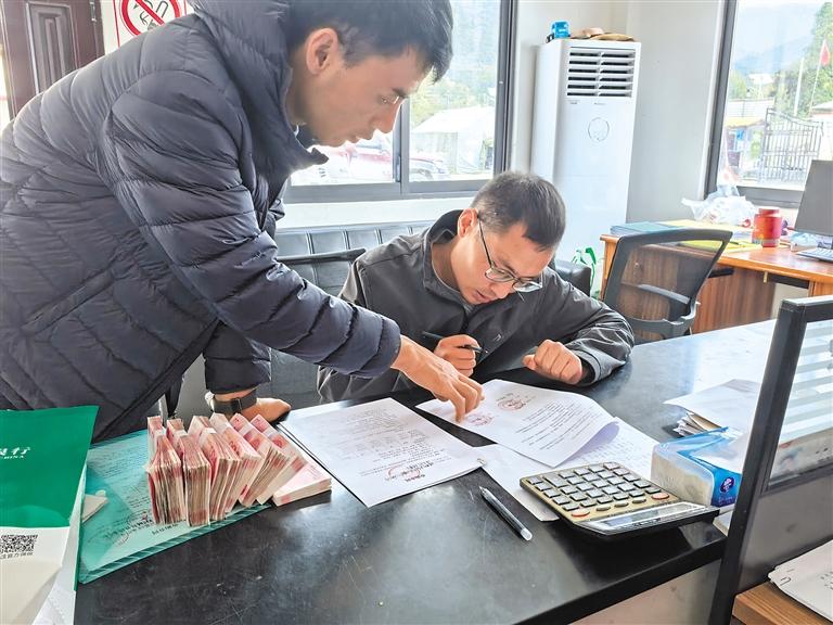 墨脫縣新創(chuàng)農(nóng)業(yè)科技開(kāi)發(fā)公司工作人員為波東村種植戶(hù)結(jié)算靈芝款。圖/文 記者 王珊 劉楓