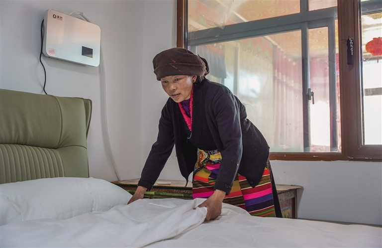 倫珠曲珍今年40歲,是這家的二女兒,15年前嫁到外村,每年都會回來看望父母。由于同行的人員出現(xiàn)高反癥狀,倫珠曲珍便主動邀請記者到他們家的“高原暖心房”里休息調(diào)整?!案咴姆俊痹O(shè)置在她家客廳的里側(cè),屋內(nèi)寬敞明亮、干凈整潔。墻壁上的恒溫裝置讓屋子始終保持在宜人的20攝氏度左右?!拔覀兇蛟斓摹咴姆俊銣匦Ч貏e好,最高溫度能達到30多攝氏度。而且因為使用的材質(zhì)特殊,就算不開恒溫裝置,幾個人待在屋里也不會覺得冷??纯催@些家具,都是村里愛心小屋提供的?!绷涡駯|介紹道。