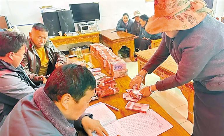 圖為工布江達(dá)縣工布江達(dá)鎮(zhèn)結(jié)地崗村向群眾發(fā)放分紅款。