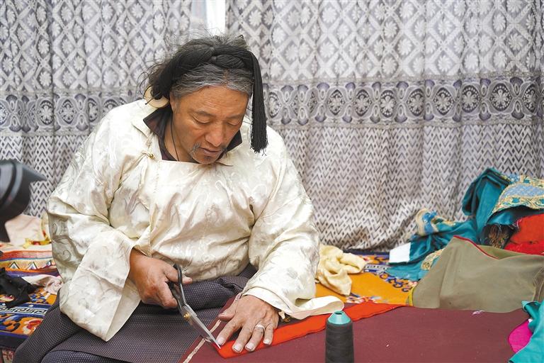圖為次歐正在裁剪藏裝。記者 萬(wàn)靖 攝