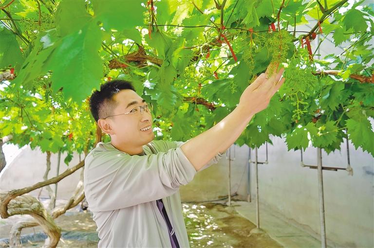 西藏農(nóng)牧科學院現(xiàn)代化葡萄種植示范基地內(nèi),工作人員正在查看葡萄長勢。