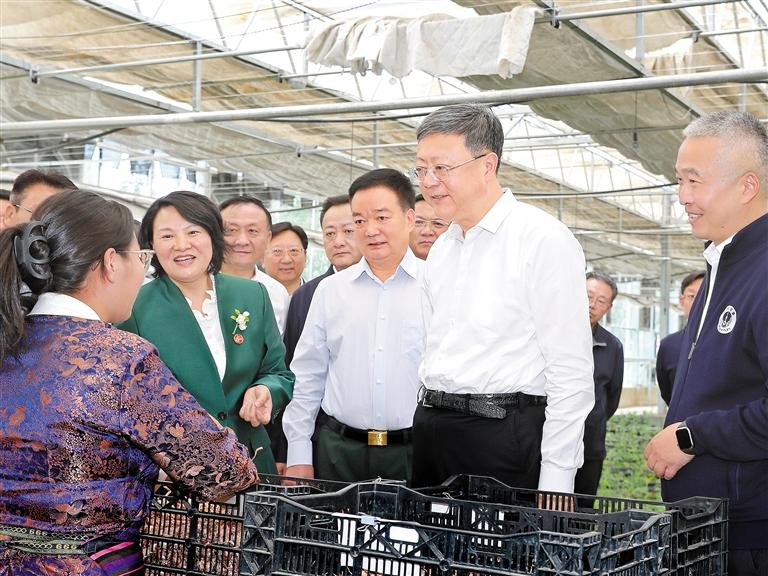 來到薩迦縣國家現(xiàn)代農(nóng)業(yè)產(chǎn)業(yè)園,溫室大棚內(nèi)作物長勢良好,一派生機盎然。近年來,在自治區(qū)黨委的大力推動下,上海市援藏力量主動作為,助力當?shù)卮罅Πl(fā)展高原特色農(nóng)業(yè),不斷拓寬群眾增收渠道。代表團走進產(chǎn)業(yè)園,聽取高原藜麥種源科技和產(chǎn)業(yè)發(fā)展、藏紅花種植技術(shù)創(chuàng)新和產(chǎn)業(yè)幫扶情況介紹,察看相關(guān)產(chǎn)品展示,與園區(qū)、企業(yè)負責人和科研團隊深入交流,就進一步推進高寒地區(qū)現(xiàn)代農(nóng)業(yè)全產(chǎn)業(yè)鏈高質(zhì)量發(fā)展進行討論。兩地同志表示,要立足雙方優(yōu)勢,把上海資金、管理、科技、人才等優(yōu)勢與西藏資源、區(qū)位等優(yōu)勢相結(jié)合,進一步做強特色產(chǎn)業(yè)、打響高原品牌,在以銷定產(chǎn)、產(chǎn)品推廣等方面開展深度合作,促進西藏優(yōu)質(zhì)資源變成好產(chǎn)品、走向大市場、賣出好價錢,有效帶動群眾就業(yè)增收,讓各族群眾錢包鼓起來、日子好起來。