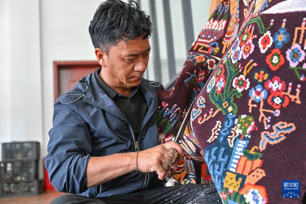 7月18日,工作人員在江孜藏毯文化發(fā)展有限責(zé)任公司內(nèi)給藏毯剪花。新華社記者 李鑫 攝