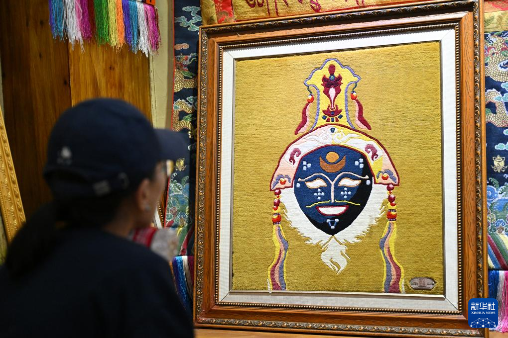 7月18日,一名參觀者在江孜藏毯文化發(fā)展有限責(zé)任公司的展示廳內(nèi)觀看藏戲臉譜圖樣的藏毯產(chǎn)品。新華社記者 李鑫 攝