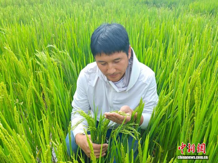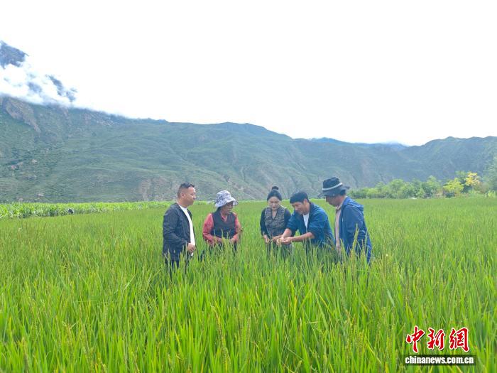 8月11日,范春捆在西藏山南加查縣冷達(dá)鄉(xiāng)共康村水稻田里觀察水稻孕穗情況。中新社發(fā) 陳立超 攝