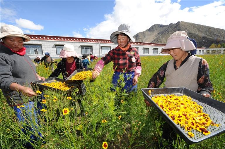 圖為拉薩市曲水縣才納鄉(xiāng)現(xiàn)代農(nóng)業(yè)科技園的工作人員正在采摘雪菊。西藏日報(bào)記者 白瑪澤旺 攝
