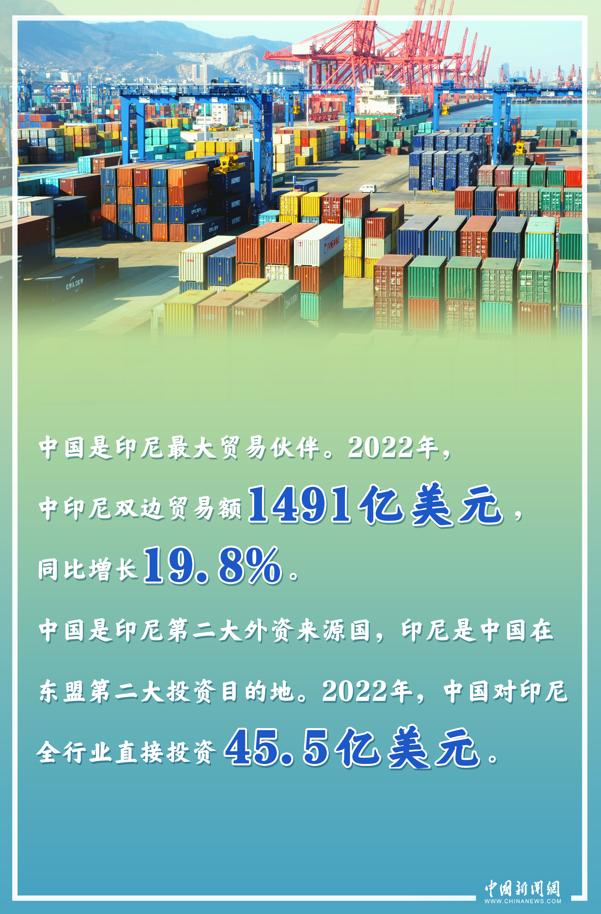 中國(guó)是印尼最大貿(mào)易伙伴。2022年,中印尼雙邊貿(mào)易額1491億美元,同比增長(zhǎng)19.8%。中國(guó)也是印尼第二大外資來(lái)源國(guó),印尼是中國(guó)在東盟第二大投資目的地。2022年,中國(guó)對(duì)印尼全行業(yè)直接投資45.5億美元。