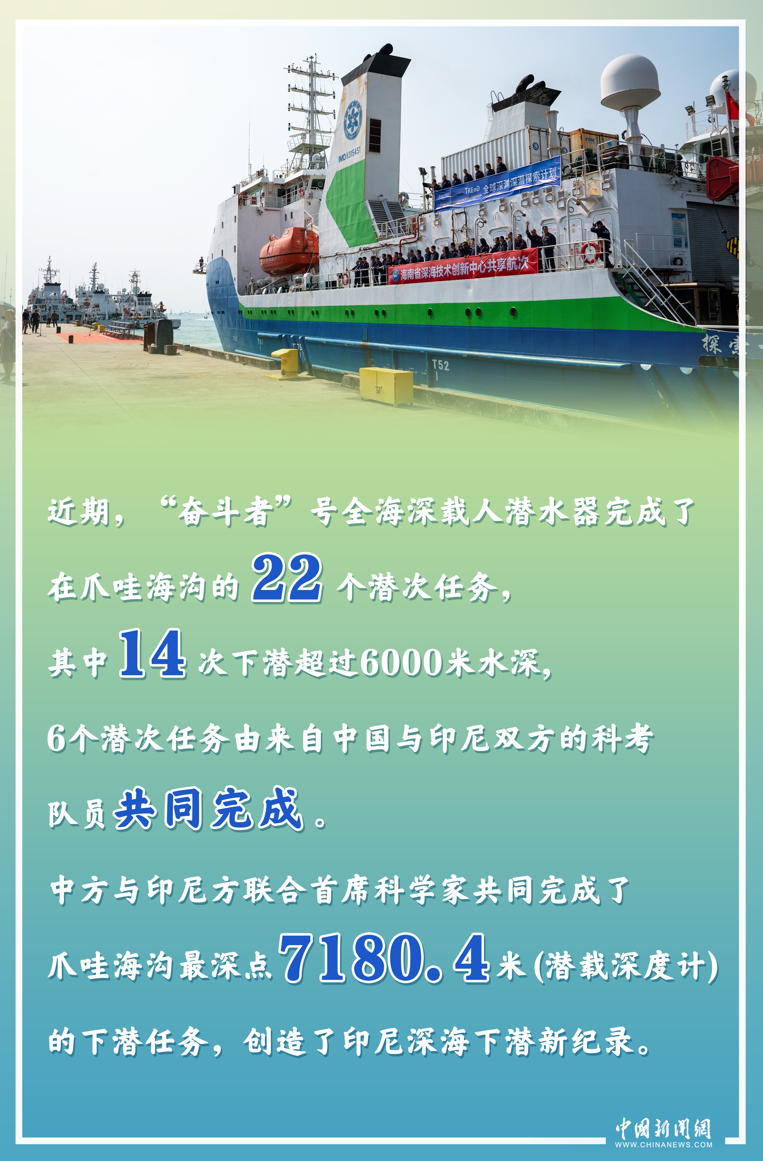 近期,“探索一號(hào)”科考船搭載著“奮斗者”號(hào)全海深載人潛水器,圓滿完成首次中國(guó)-印度尼西亞爪哇海溝聯(lián)合深潛科考航次任務(wù),創(chuàng)造了印尼深海下潛新紀(jì)錄,為兩國(guó)加強(qiáng)海洋合作,開(kāi)啟了新篇章。