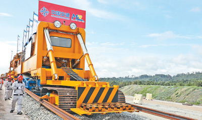 在馬來西亞彭亨州關丹市馬東鐵項目現(xiàn)場,鋪軌機正在作業(yè)。
