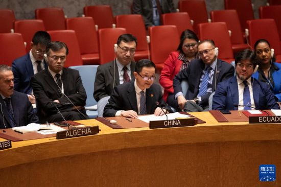 4月14日,在位于紐約的聯(lián)合國總部,中國常駐聯(lián)合國代表團臨時代辦戴兵(前中)在安理會就伊朗襲擊以色列舉行的緊急會議上發(fā)言。新華社記者 謝鍔 攝
