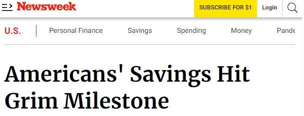 美國富國銀行(Wells Fargo)分享給《新聞周刊》(Newsweek)的一份分析報告顯示,美國人的儲蓄速度正在下降,達到一年多來的最低水平。與此同時,另一項調(diào)查指出,近38%的美國人不得不動用儲蓄或求助家人朋友以應(yīng)對日常支出。有超過半數(shù)的美國人認為通脹是美國當前面臨的一個比移民和犯罪等更大的問題。
