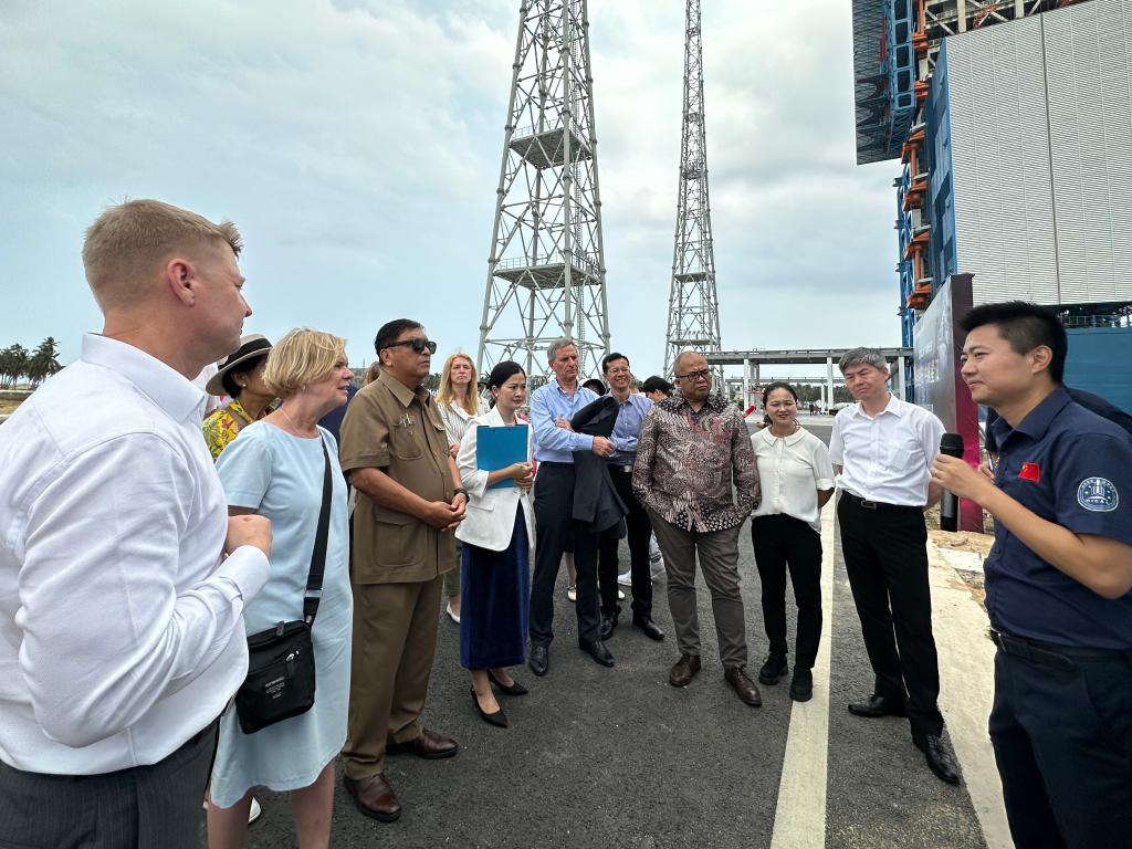 23日下午,使節(jié)團(tuán)走進(jìn)了正在建設(shè)中的海南國際商業(yè)航天發(fā)射中心現(xiàn)場,站在已經(jīng)竣工的一號發(fā)射工位旁,使節(jié)們紛紛掏出手機(jī),從不同角度拍攝高聳入云的發(fā)射塔架。不等工作人員講解,不少使節(jié)圍上前問出心中的好奇。