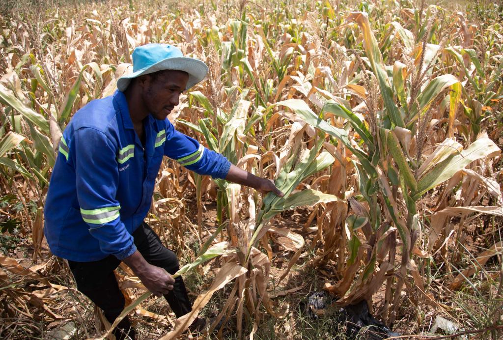 4月3日,農(nóng)民在津巴布韋首都哈拉雷近郊的一塊玉米地檢查作物長勢。津巴布韋總統(tǒng)姆南加古瓦宣布,由于厄爾尼諾現(xiàn)象造成嚴重干旱,全國進入災(zāi)害狀態(tài)。新華社發(fā),肖恩·朱薩攝