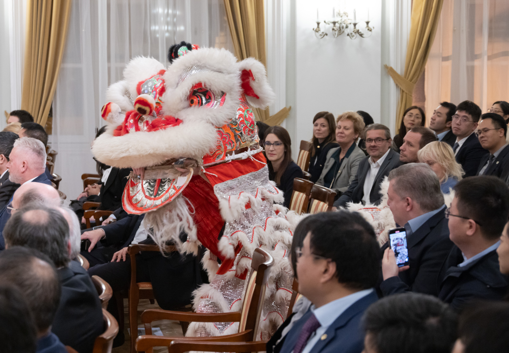 2023年11月20日,匈牙利羅蘭大學(xué)中文系成立100周年慶典在匈首都布達(dá)佩斯舉行,中匈各界百余名代表參加。圖為慶典上拍攝的舞獅表演。新華社發(fā)(弗爾季·奧蒂洛攝)