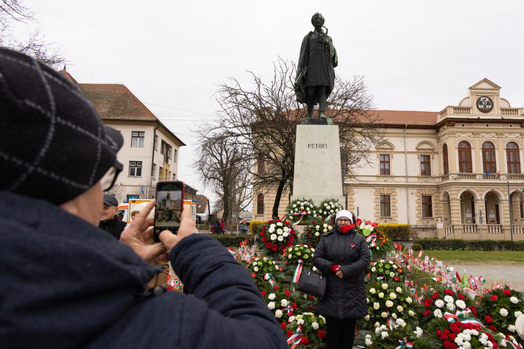 2023年3月15日,匈牙利首都布達(dá)佩斯和裴多菲出生地小克勒什舉行慶?;顒?,紀(jì)念1848年革命和自由斗爭175周年。圖為民眾當(dāng)日在小克勒什的裴多菲雕像前拍照留念。新華社發(fā)(弗爾季·奧蒂洛攝)