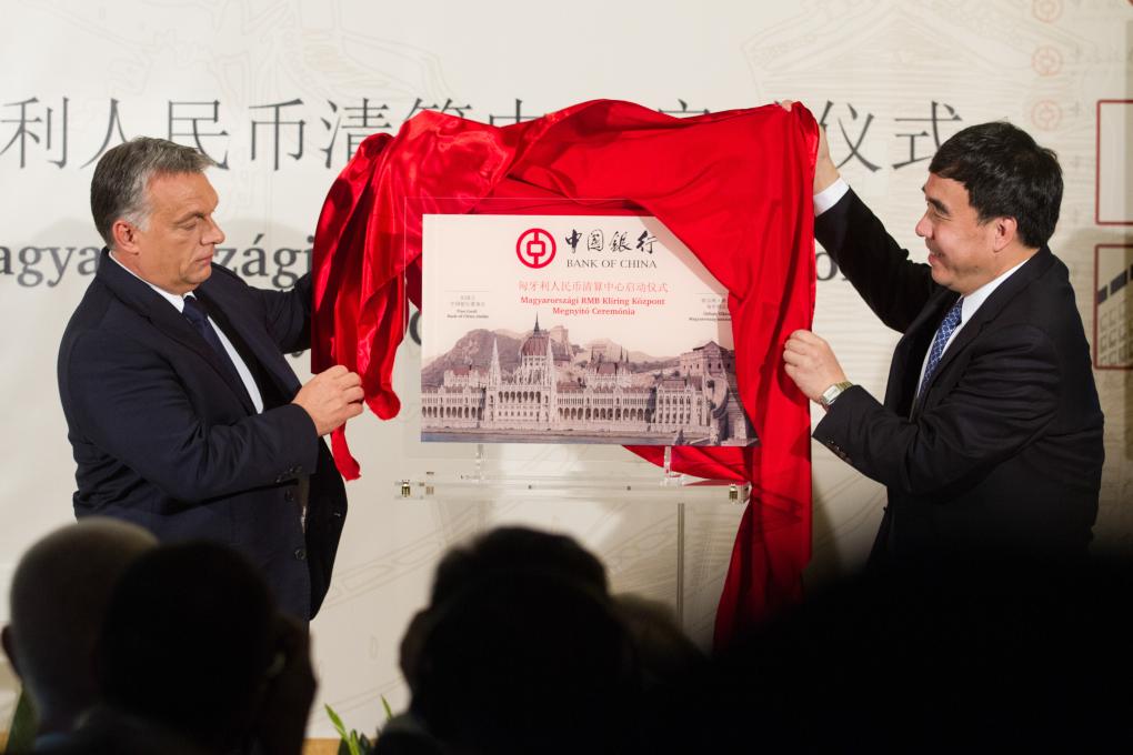 2015年10月2日,匈牙利總理歐爾班(左)在布達(dá)佩斯參加匈牙利人民幣清算行啟動儀式。該行成為中東歐首家人民幣清算行。新華社發(fā)(弗爾季·奧蒂洛攝)