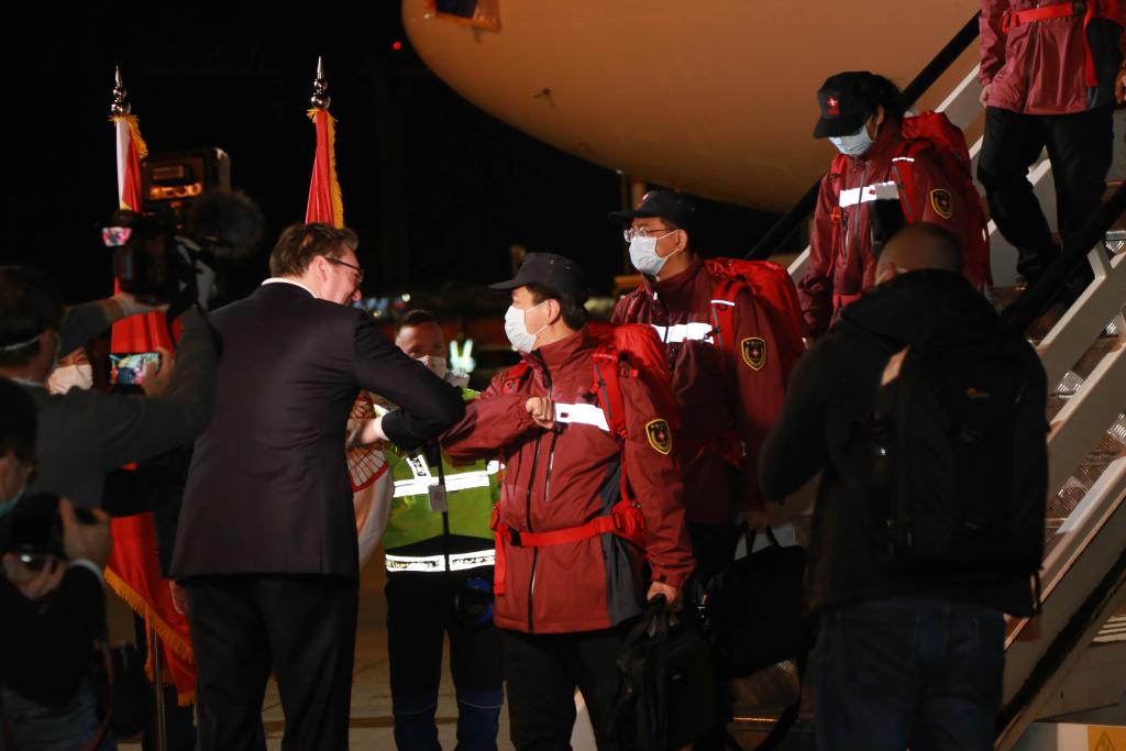 2020年3月21日,在塞爾維亞首都貝爾格萊德,前來迎接的塞爾維亞總統(tǒng)武契奇(左)與中國(guó)援助塞爾維亞抗疫醫(yī)療專家組成員“碰肘”致意。新華社記者石中玉攝