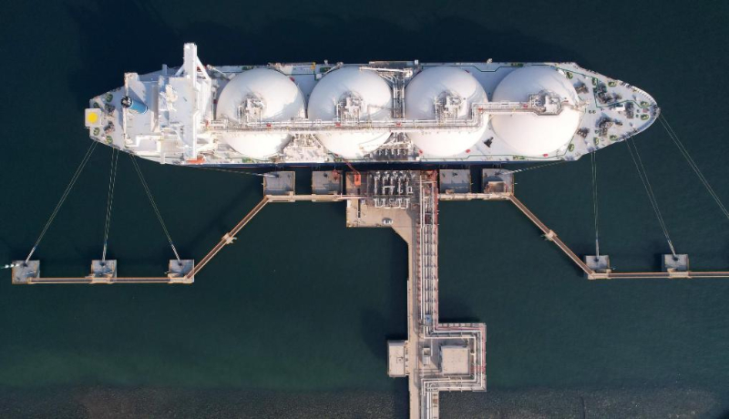 2022年10月21日,一艘液化天然氣運輸船靠泊在中國石化天津LNG接收站“1號泊位”進(jìn)行卸船作業(yè)(無人機(jī)照片)。新華社記者趙子碩攝