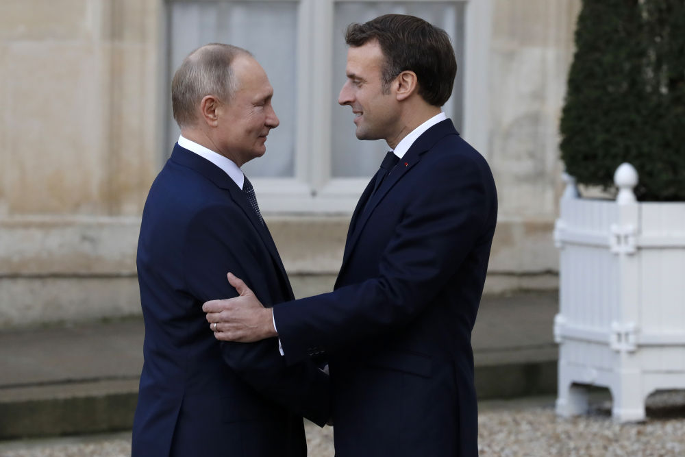 2019年12月9日,在法國巴黎,法國總統(tǒng)馬克龍(右)迎接前來參加“諾曼底模式”四國峰會的俄羅斯總統(tǒng)普京。新華社發(fā)(杰克·陳攝)