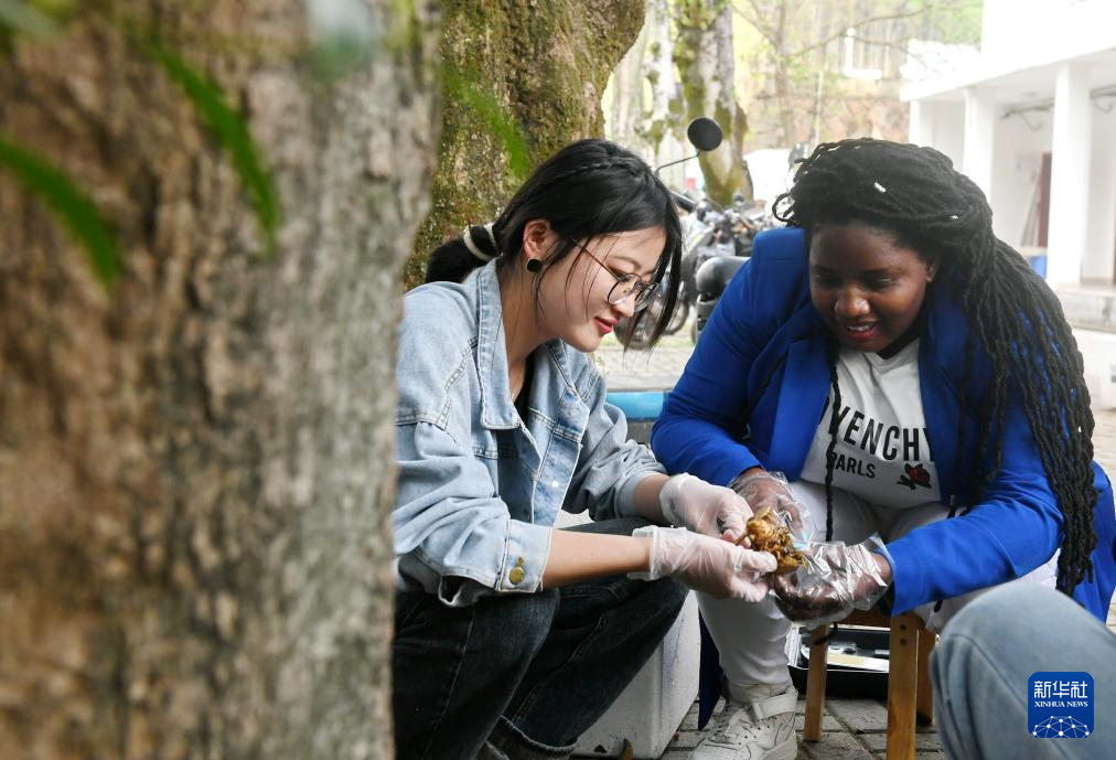 2024年3月28日,在位于福州的福建農(nóng)林大學(xué),來自盧旺達(dá)的梅迪在國(guó)家菌草工程技術(shù)研究中心向中國(guó)學(xué)生嘉欣瑤了解“綠洲3號(hào)”菌草品種。新華社記者 林善傳 攝