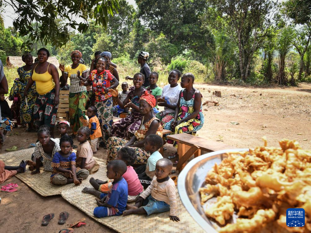 2024年2月5日,在中非共和國(guó)班吉的格巴村,村民們?cè)诘却迈r炸蘑菇。新華社記者 韓旭 攝