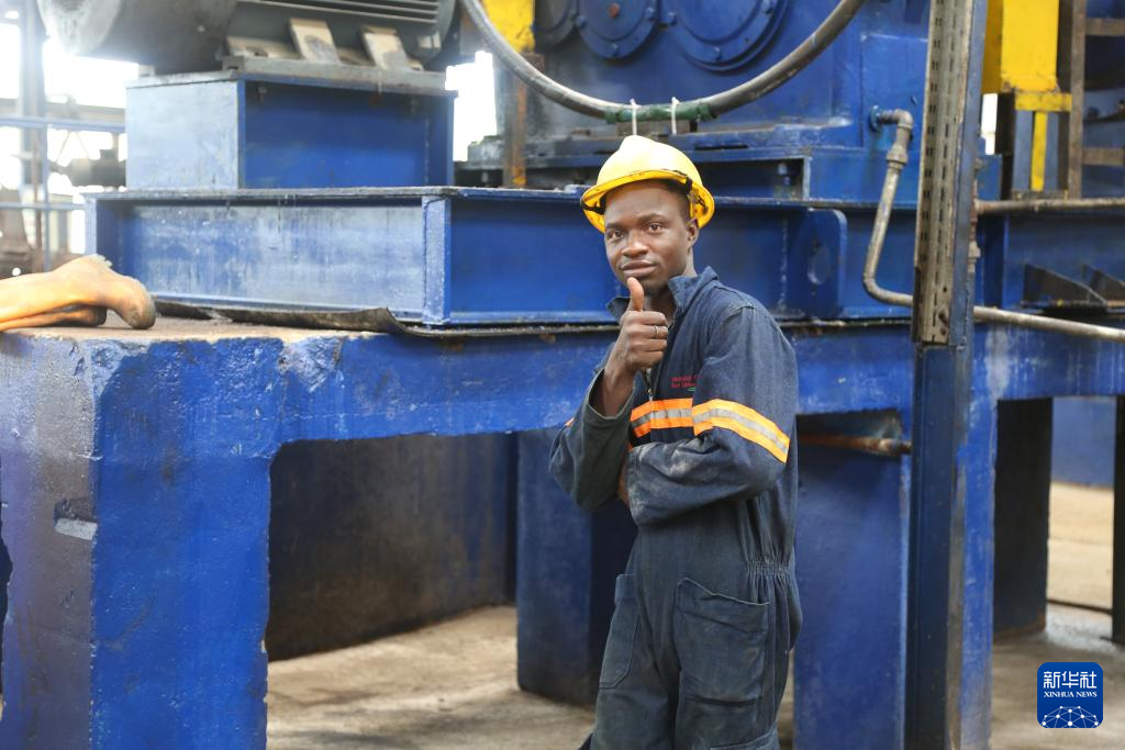 2024年6月10日,在科特迪瓦南部城鎮(zhèn)達(dá)布郊區(qū),美蘭橡膠加工廠工人在機(jī)器旁豎起大拇指。新華社記者 張健 攝