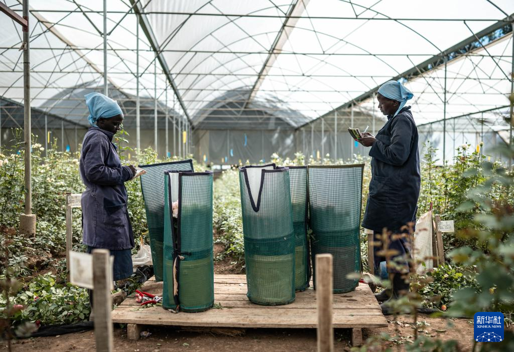 2024年5月18日,在肯尼亞納紐基,坦布濟(jì)鮮花公司的員工在鮮花大棚內(nèi)整理鮮花。新華社記者 王冠森 攝