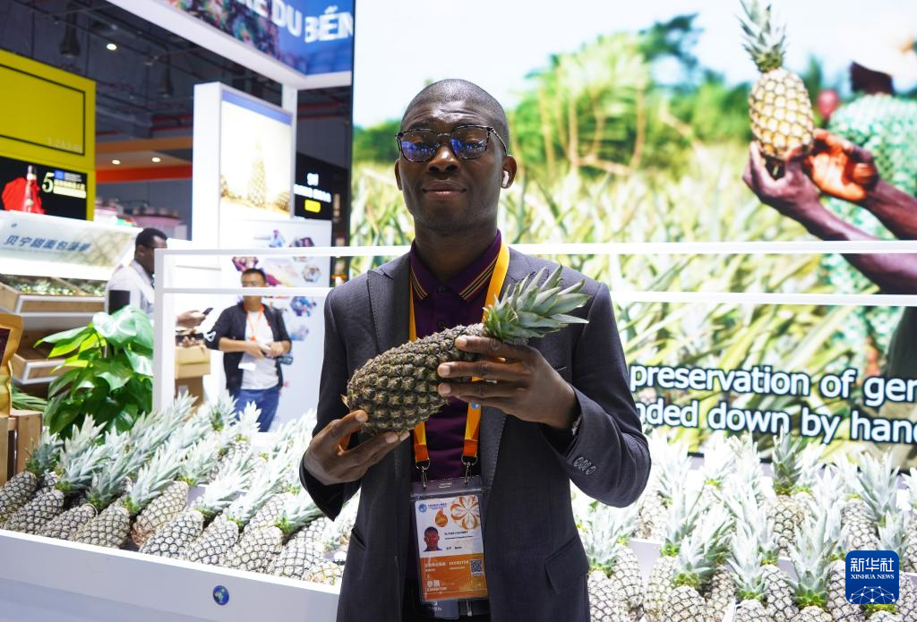 2023年11月8日,在第六屆進(jìn)博會(huì)食品及農(nóng)產(chǎn)品展區(qū)貝寧菠蘿展臺(tái),工作人員愛力舍展示貝寧菠蘿。這是貝寧菠蘿第一次參加進(jìn)博會(huì)。新華社記者 金皓原 攝